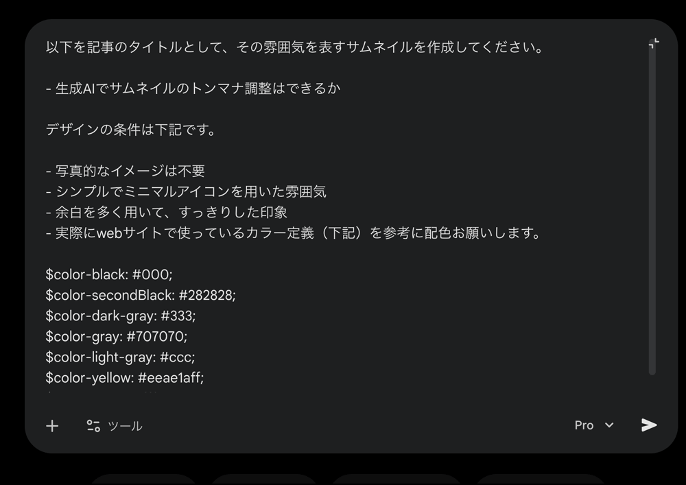 今回はこのAI生成っぽいサムネイルをどこまで自分のwebサイトのトンマナに寄せられるかGeminiで検証してみました。