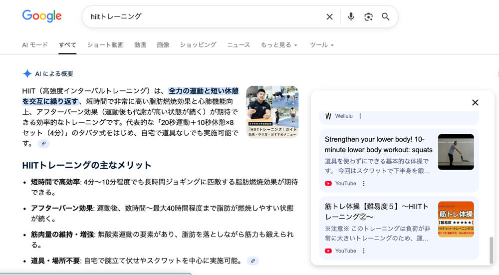 検索結果でAI Overviewsが利用されると、下記のような検索結果の画面になります。