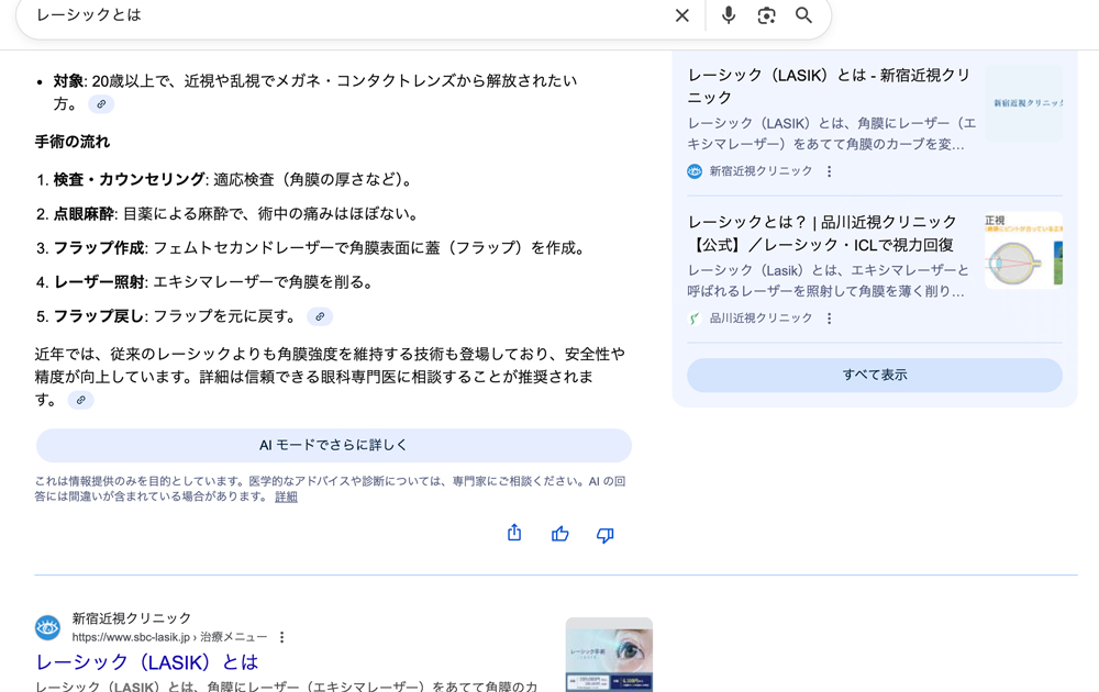 新宿近視クリニックと言うところが、ソースとして選ばれていますが、検索結果上も上位に表示しています。(見切れていますが、品川近視クリニックもこの下にあり)